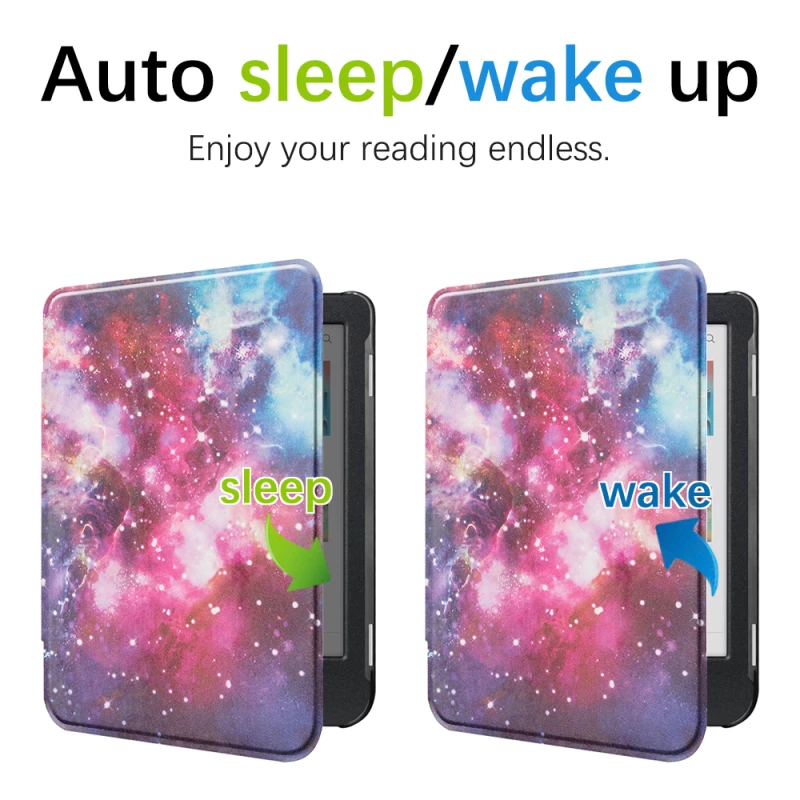 - Auto Sleep функция: Интелигентната функция auto sleep автоматично включва и изключва екрана на електронния четец при отваряне и затваряне на капака, спестявайки батерия и удължавайки времето за четене.