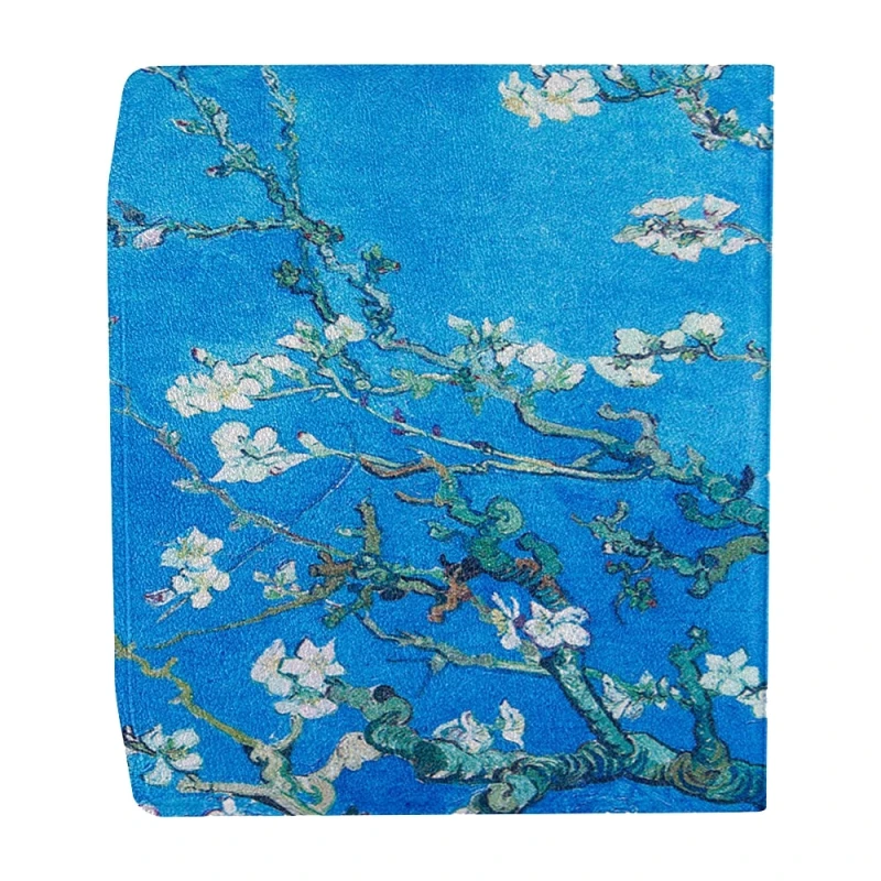 Външната страна на аксесоара е украсена с пълноцветен принт на "Бадемов цвят" от Ван Гог. Деликатните бели и бледорозови цветове на фона на богат, текстуриран син фон придават на калъфа уникален артистичен вид. Така електронната ви книга се превръща не просто в устройство за четене, а в елегантно допълнение към вашия стил.