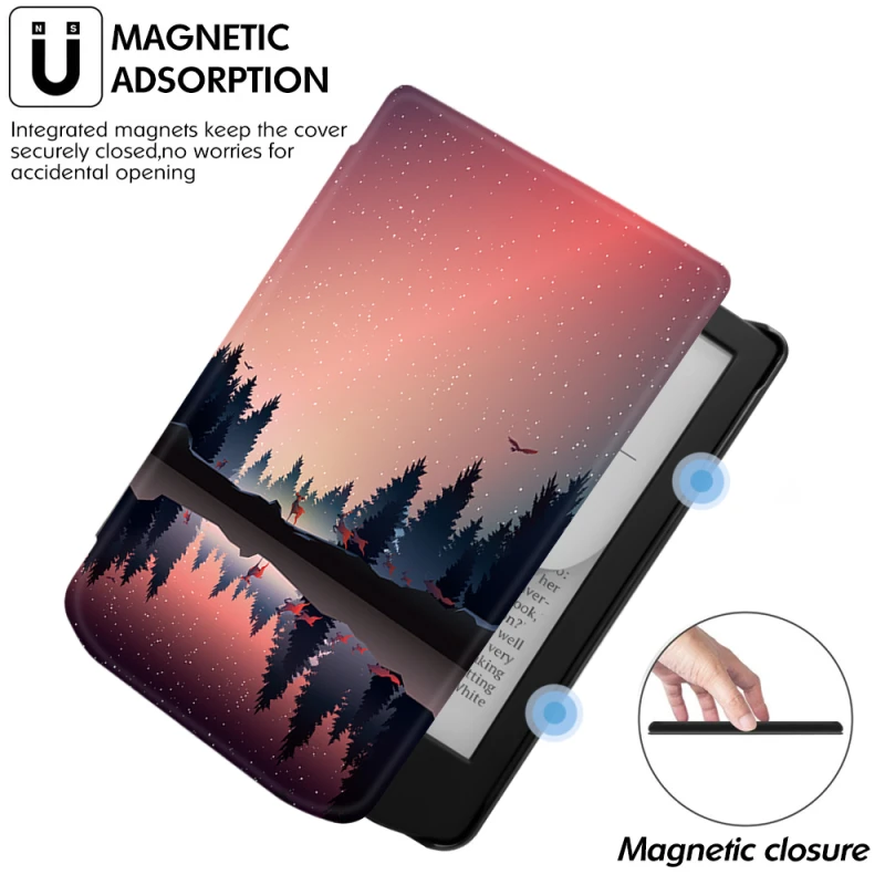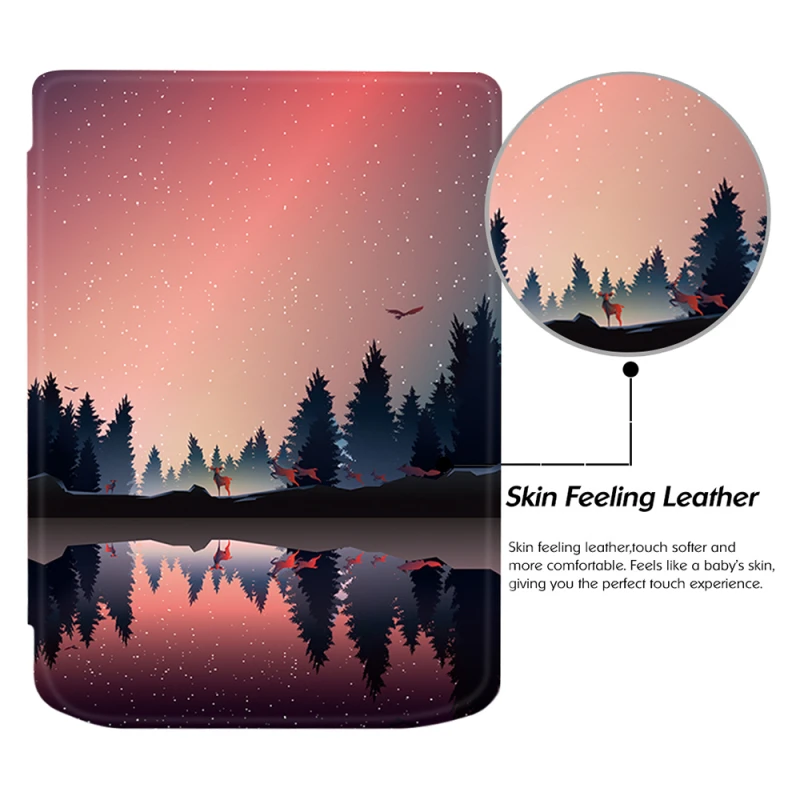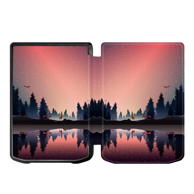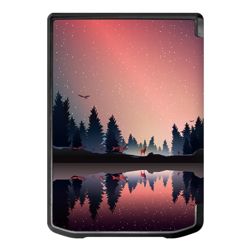Вдъхновен от магията на природата, защитният калъф за четец Pocketbook Verse Lite разкрива уникален дизайн, пресъздаващ спокойна нощна сцена. Изображението на тъмна горска силует на фона на преливащо звездно небе и отражение във водна повърхност, допълнено от елен сред дърветата, придава изтънчен и артистичен вид. Подобен дизайн не само привлича погледа, но и подчертава индивидуалността на притежателя.