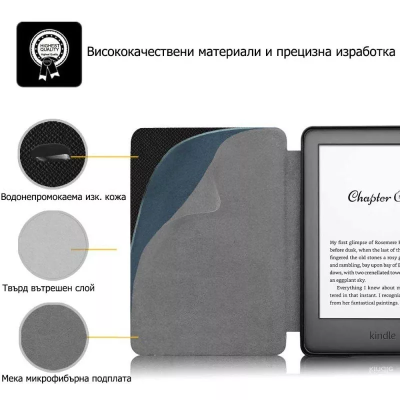 Благодарение на магнитното затваряне и функцията за автоматично включване/изключване, този калъф не само улеснява ежедневната употреба, но и добавя финален завършек към елегантността на вашия Kindle. Насладете се на удобството да четете навсякъде, без да се притеснявате за безопасността на устройството си.