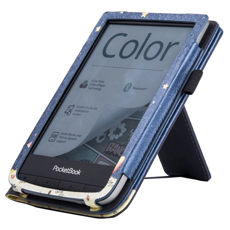 - Вградена стойка: Функцията за прегъване позволява лесно позициониране на електронния четец в изправено положение, идеално за четене без ръце.