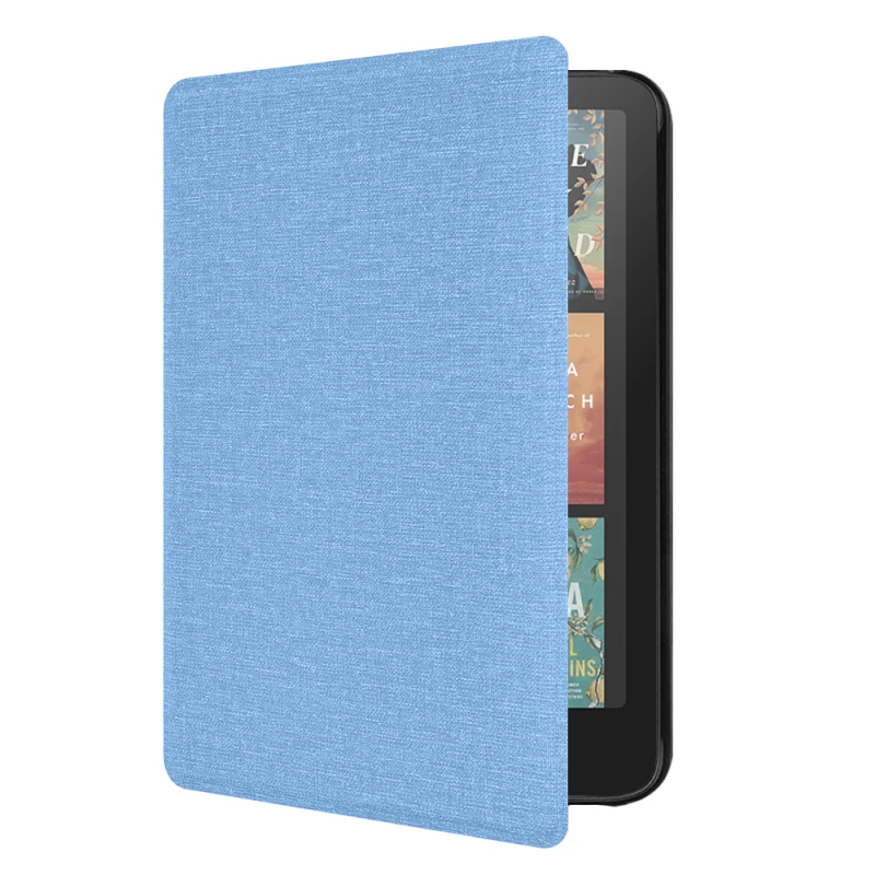 * **Магнитно затваряне:** Сигурно и удобно затваряне, което предотвратява случайно отваряне на калъфа в чантата или джоба. * **Автоматична функция Auto Sleep/Wake:** Интелигентен дизайн, който автоматично "събужда" вашия електронен четец при отваряне и го "приспива" при затваряне, оптимизирайки живота на батерията. * **Издръжлива на износване изкуствена кожа:** Висококачествен материал, имитиращ велур, който осигурява дълготрайност и приятно усещане при допир, съчетавайки се с елегантна светлосиня текстура. * **Прегъване на две за лесно четене с една ръка:** Иновативен дизайн, който позволява лесно прегъване на предния капак, превръщайки четенето с една ръка в удобно и приятно преживяване. * **Слим дизайн:** Поддържа компактните размери на електронната книга, без да добавя излишно тегло или обем. * **Подсилена предна и задна част:** Допълнителна защита за екрана и корпуса на вашия Kindle, осигуряваща устойчивост срещу удари и натиск.Функционалност за Максимален Комфорт