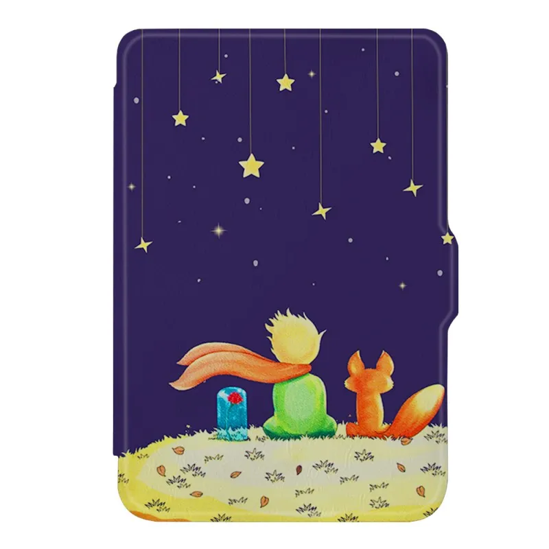 Предната част на защитния аксесоар е украсена с нежна илюстрация, пресъздаваща емблематични сцени от "Малкия принц". Изображението показва рус герой, седящ до лисица на зелена могила, вперени погледи към дълбоко лилаво нощно небе, осеяно с множество жълти звезди. До тях се вижда и синя стъклена камбана с червена роза, което допълва класическия и разпознаваем мотив. Този уникален дизайн превръща всеки e-reader калъф в произведение на изкуството, носещо усещане за приказка и вдъхновение.
