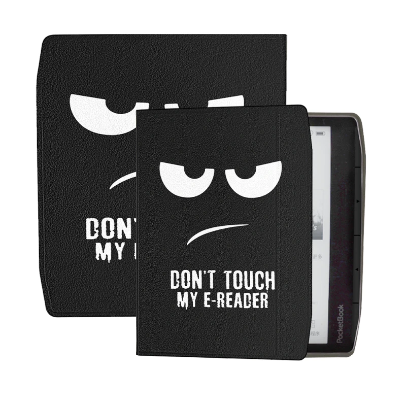 Този черен **калъф GARV Slim за Pocketbook Era** се отличава със своя тънък профил и подсилена предна и задна част, осигурявайки максимална защита без излишен обем. Изработен от висококачествена изкуствена кожа с деликатна текстура, той осигурява приятно усещане при допир и дълготрайна издръжливост. Хумористичната бяла графика на "Angry Face" и текстът "DON'T TOUCH MY E-READER" добавят закачлив акцент, превръщайки го в идеално допълнение за хора с чувство за хумор.Функционалност за удобно четене