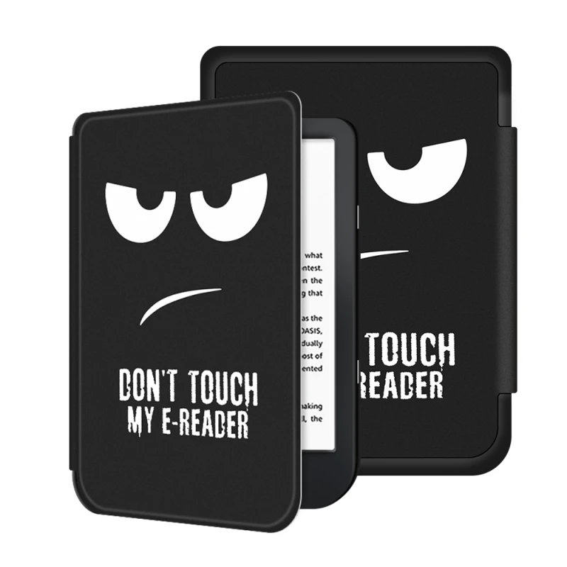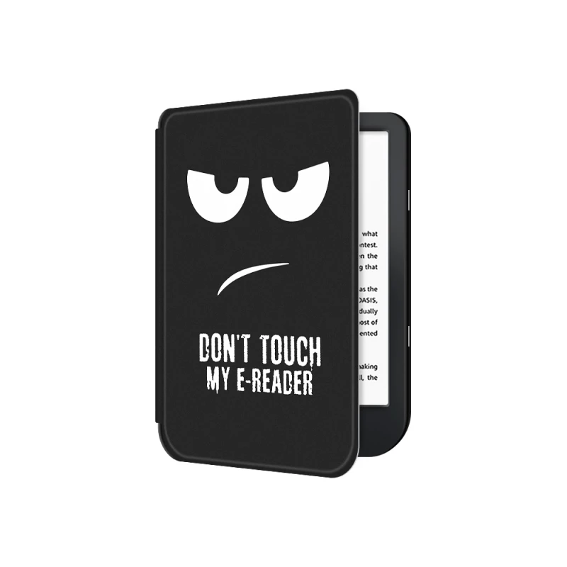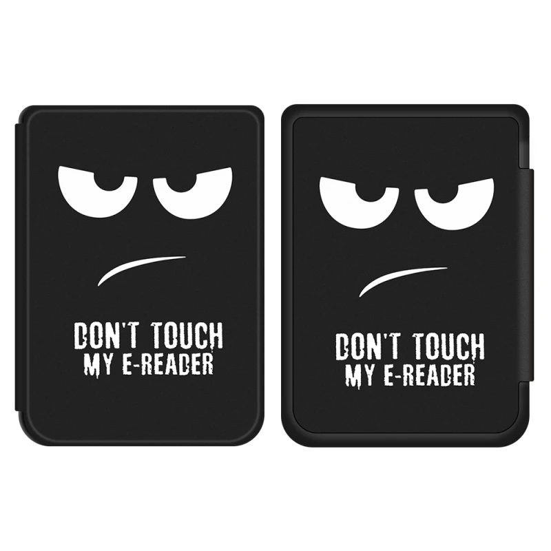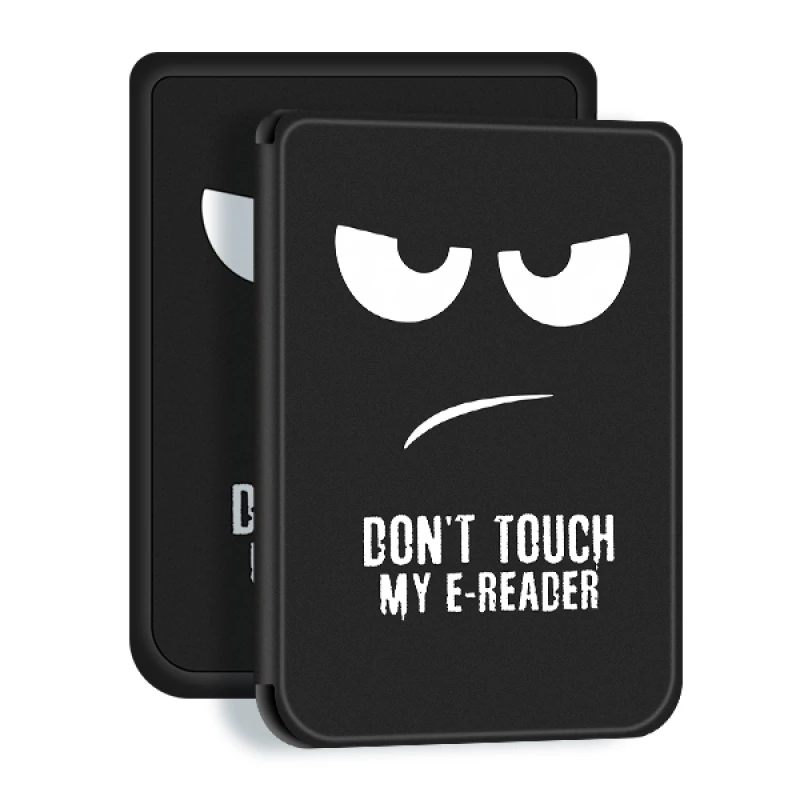 - Иновативен дизайн с послание: Отличава се с хумористично, нацупено бяло лице и дръзкия надпис "DON'T TOUCH MY E-READER" на предния капак. Вътрешната част продължава мотива с "TOUCH READER", създавайки закачливо предупреждение за всеки, който се доближи до вашата електронна книга.